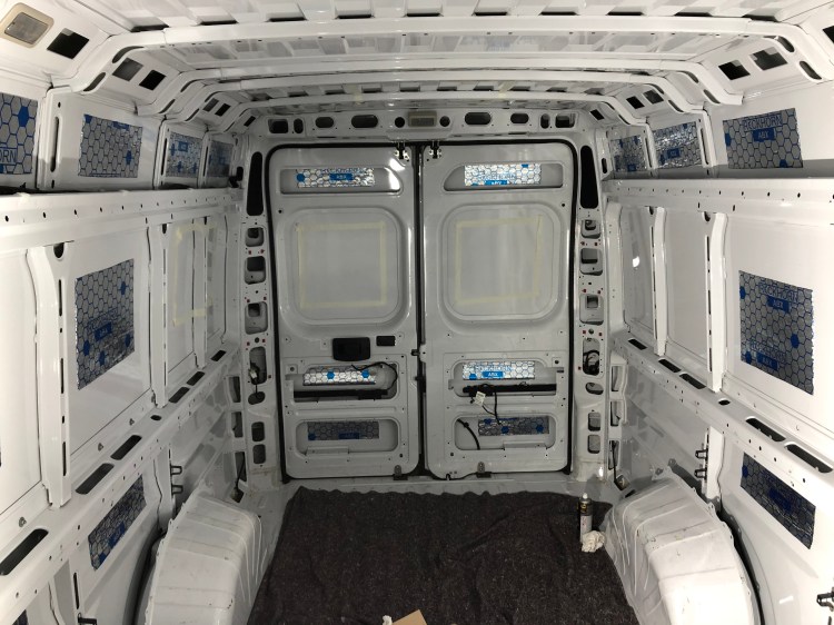 Damit es nicht mehr so klappert, dämmen wir die Karosse mit Alubutyl gegen Geräusche. Mit Handschuhen und einer Schere lässt es sich erstaunlich gut verarbeiten und hält super. Am Kopf- und Fußende des Bettes entfernen wir auch schon die Holme, damit wir uns später schön lang machen können und nicht die Füße einziehen müssen.