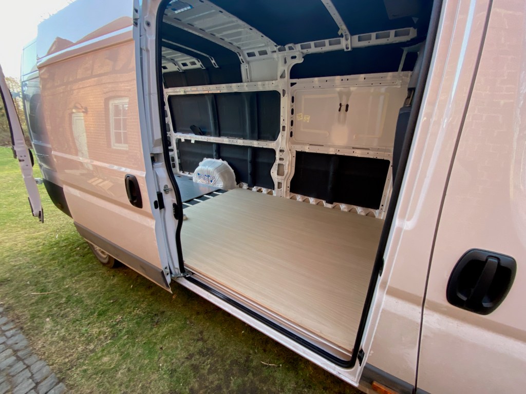 Es ist viel passiert. Wir haben geplant, organisiert und ganz viel Holz besorgt, um mit dem Innenausbau weitermachen zu können. Wir sind bei Schnee mit einem sehr ausladenden Anhänger voller Holzplatten vorsichtig vor der Polizei her gefahren, in der Hoffnung, dass sie nicht befinden, dass die Platten zu weit überstehen. Haben sie zum Glück nicht. Wir sind inzwischen Stapelkönige in der Garage und haben auch schon die beiden Bodenplatten passend zugesägt und die Oberfläche behandelt, sodass sie nun gut in den Innenraum passen und gegen potenziell verschütteten Kaffee geschützt sind. Wir sind zufrieden mit der Wahl der Eichefurnier-Platten, sie machen sich sehr gut.