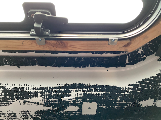 Nach ein bisschen googeln wird klar: das ist auch anderen schon öfter passiert und liegt wohl an einem konstruktionsbedingten Baufehler der Fenster. Durch das Scharnier im Außenbereich kann das Wasser in den Rahmen gelangen und läuft dort dann nach unten, wo es sich sammelt und das Holz aufweicht. In einigen Videos und Foren finden wir dieses Problem ebenfalls. Wir kontaktieren die Firma, auch hier scheint der Wassereinbruch nicht unbekannt zu sein. Nun hoffen wir auf einen Fenstertausch gegen ein neues Modell und raten vorerst allen vom Einbau von „Carbest RW Eco“ Fenstern ab. Zur Sicherheit verdecken wir das Heck mit einer Plane, so bleibt es hoffentlich trotz Regen trocken. Danach dichten wir endlich das Fenster ein.