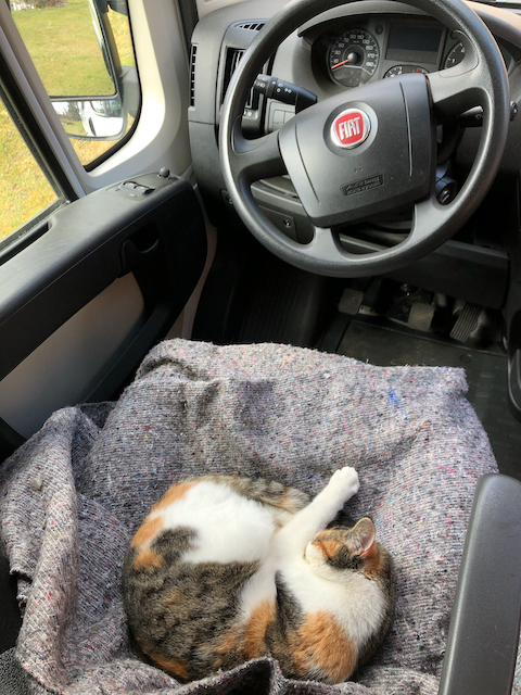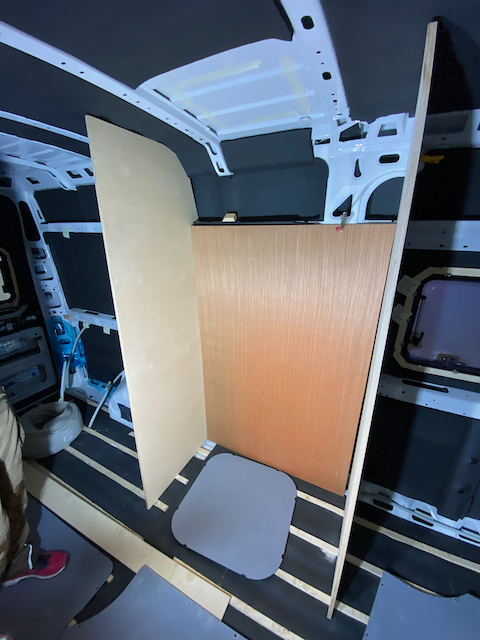 Der Plan für heute: Badseitenwände schablonieren, also an die völlig unterschiedliche gestalteten Karossengegebenheiten anpassen. Hier sind Holme, Vorsprünge, Winkel, Biegungen und Löcher zu beachten, die ein „mal eben zurecht sägen“ unmöglich machen. Wie viele Male wir die Seitenwände heute in und aus dem Auto getragen haben? Wir haben es irgendwann aufgegeben, mit zu zählen. Nach ein paar Knoten im Kopf, vielen Messungen mit dem Zollstock und Überlegungen bezüglich der besten Lösung haben wir am Nachmittag endlich die Badseitenwände soweit fertig, dass sie sowohl ordentlich mit der Rückwand abschließen als sich auch nahezu perfekt um die Karossenteile und Holme legen, die in den Raum ragen. Die Duschwanne fügt sich auch gut ein und wir sind zufrieden. Selbst der Hängeschrank passt gut neben die Badwand, so wie wir uns das gedacht haben. Nun fehlen noch ein paar Leisten, mit denen wir die Seitenwände sowie die gesamte Konstruktion so verschrauben können, dass sie uns bei einer Vollbremsung nicht um die Ohren fliegen. Wir tüfteln noch ein wenig, so wie den ganzen Tag wieder unter den Augen unserer kleinen Bauaufsicht, die müde vom Zuschauen ist und in den Autopilot-Modus geschaltet hat.
