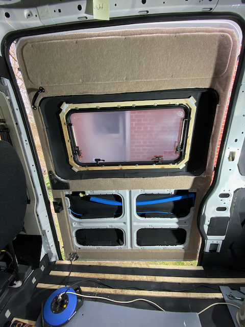 Um nicht nur auf den Bildschirm zu starren, nutzen wir eine kurze Regenpause, um unser Filz zu testen, das wir sowohl an den Türen als auch am Bett im Innenraum verkleben wollen. Die Schiebetür eignet sich dazu gut, hier haben wir für den Anfang überschaubare Konturen und kleine Blenden, die wir nur damit überziehen brauchen. Wir entscheiden uns dazu, um das Fenster eine Holzblende zu verbauen, da das Filz die Tiefen der Türgeometrie hier optisch nicht so schön ausgleichen würde. Darüber hinaus schrauben wir noch einen zusätzlichen Griff im oberen Teil der Schiebetür an, damit wir beim Öffnen nicht immer so weit nach unten greifen müssen. Unser Rücken wird es uns danken. 😉